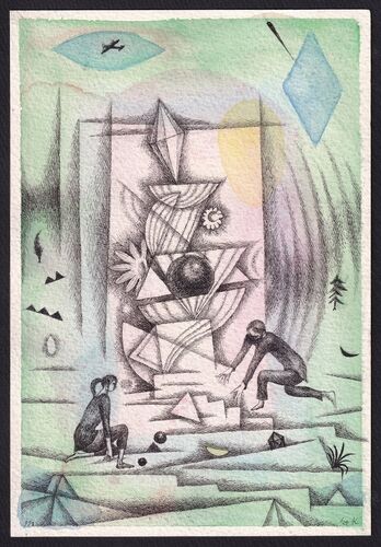 小ペン画を描くに際して、ほとんどの場合、前段階としてのイメージスケッチ(天使舞い降り)がある。だが今回の9点のうちの最初からの6点には、それがない。すでに紹介済だが、あらかじめ下彩を施しておいた用紙を凝視し、わずかなニュアンスなどから形態…